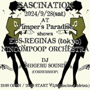 show’s: EUS REGINAS(tokyo) Nincompoop Orchestra DJ: SHIGERUSOUND (CORNERSHOP) Dos ¥3,000 (include 1drink) 19:00 open 20:00 start Pimper’s Paradise 静岡県静岡市葵区七間町8-6 1F寿司勝 本店