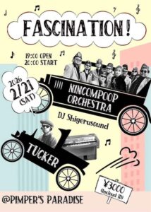 LIVE: TUCKER NINCOMPOOP ORCHESTRA DJ: Shigerusound 19:00 OPEN / 20:00 START ¥3,000 (w1D) PIMPER’S PARADISE 静岡市葵区七間町8-6 2F